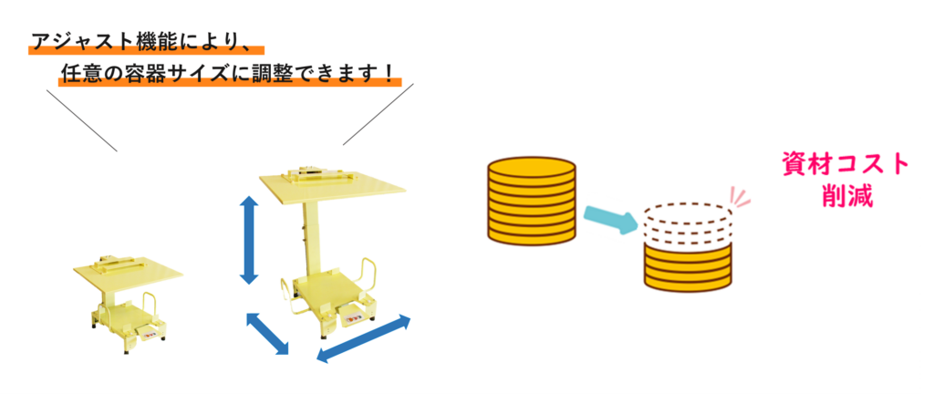 容器のサイズや素材が変わっても、ホルダーの買い替えや追加購入は一切不要で多種容器サイズ対応のアジャスタ機能で在庫管理の手間とコストを劇的に圧縮