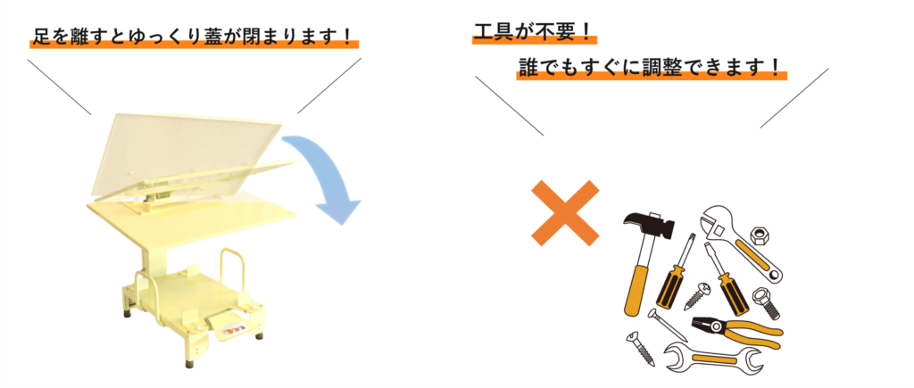 足踏み式で静かに蓋が閉まる構造。既製品に比べて壊れにくく頑丈な構造のため、転倒による液漏れ等のリスクを予防